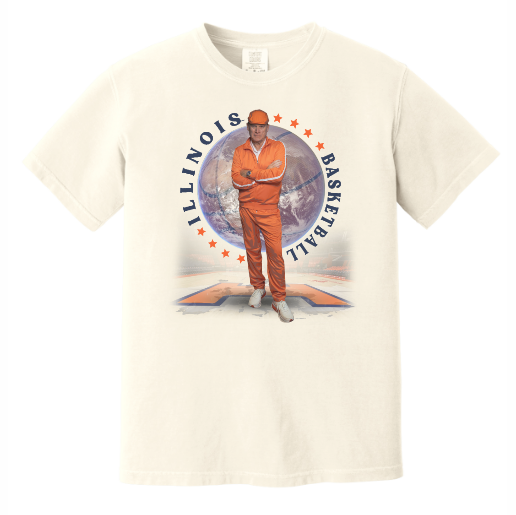 Go Illini! This Illinois Basketball tee is perfect for wearing around campus or to games. This Brad Underwood merch features an image of Brad wearing an orange tracksuit while standing in front of a globe/basketball. This Fighting Illini Basketball shirt is great for showing your Illinois spirit! This is an officially licensed collegiate product.