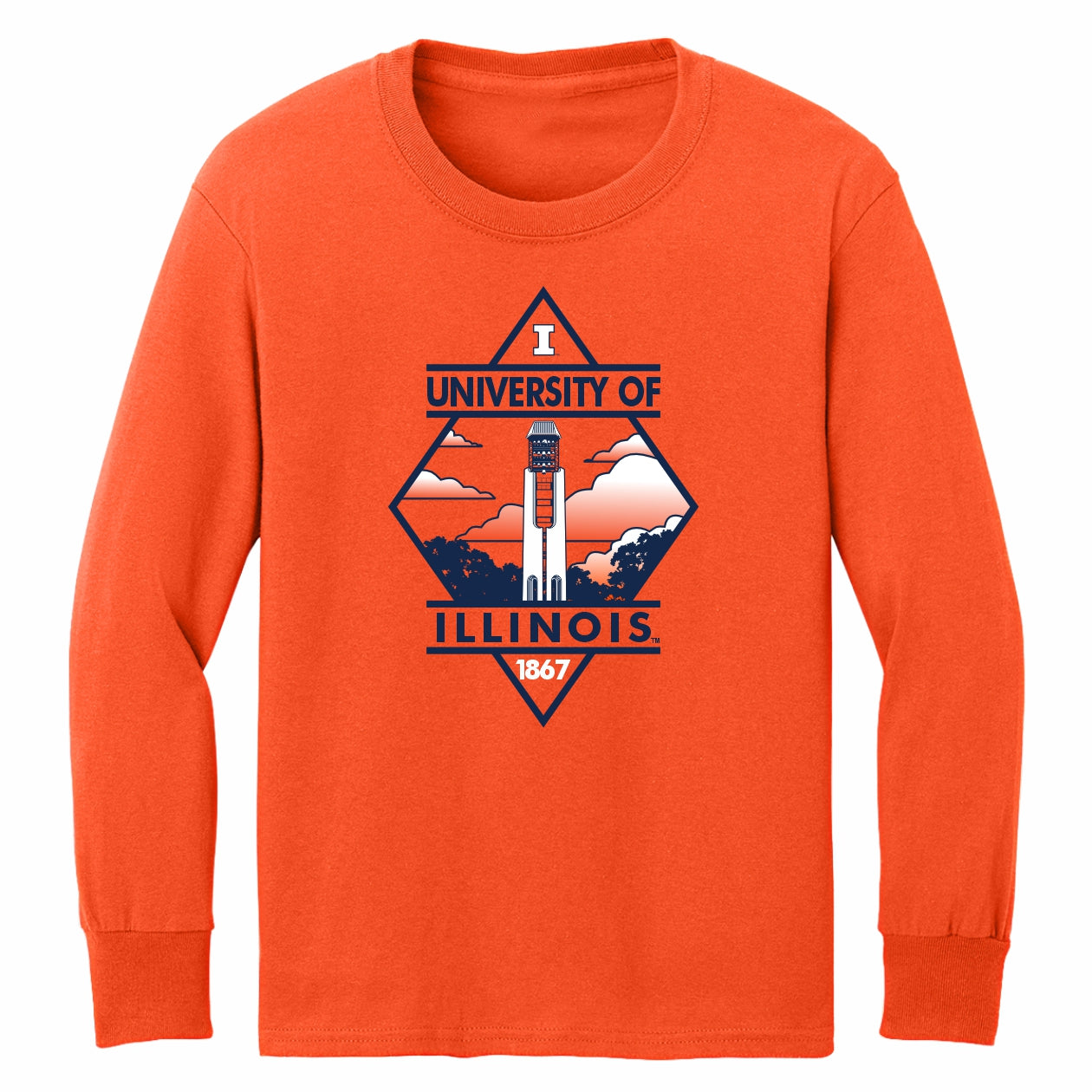 Go Illini! This Illinois shirt is perfect for your kiddo! This BOGO shirt features an orange body with a navy and white bell tower design that will really make your kiddo's Illinois spirit shine through! This is an officially licensed collegiate product.
