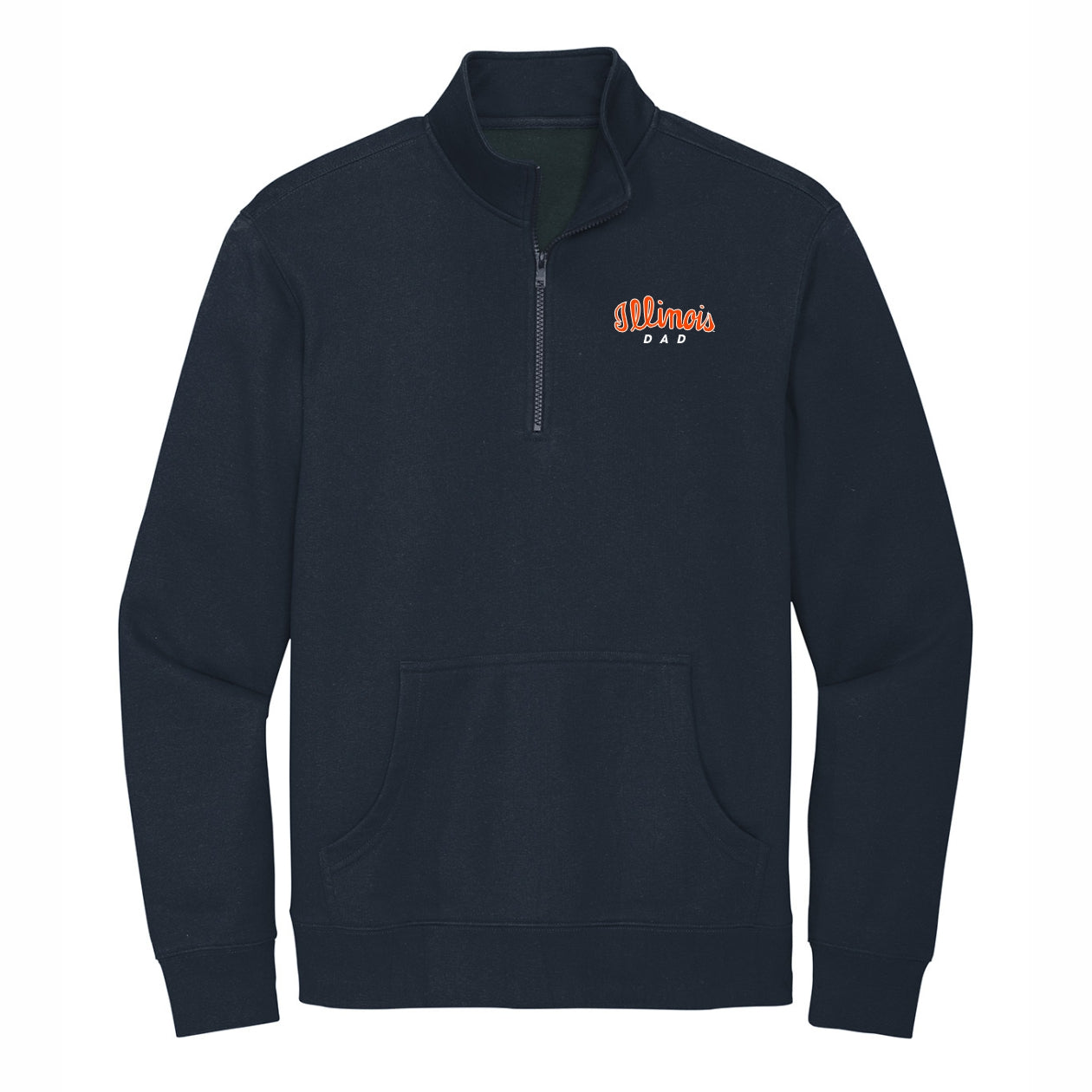 Hail to the orange! This Illinois quarter-zip is a great way to show your dad's Fighting Illini spirit! This men's pullover features a navy body with an orange script "Illinois" on the left chest over a white "Dad" that is great for any occasion. Make sure to pick up this new jacket to show off your Illini pride! This is an officially licensed collegiate product.