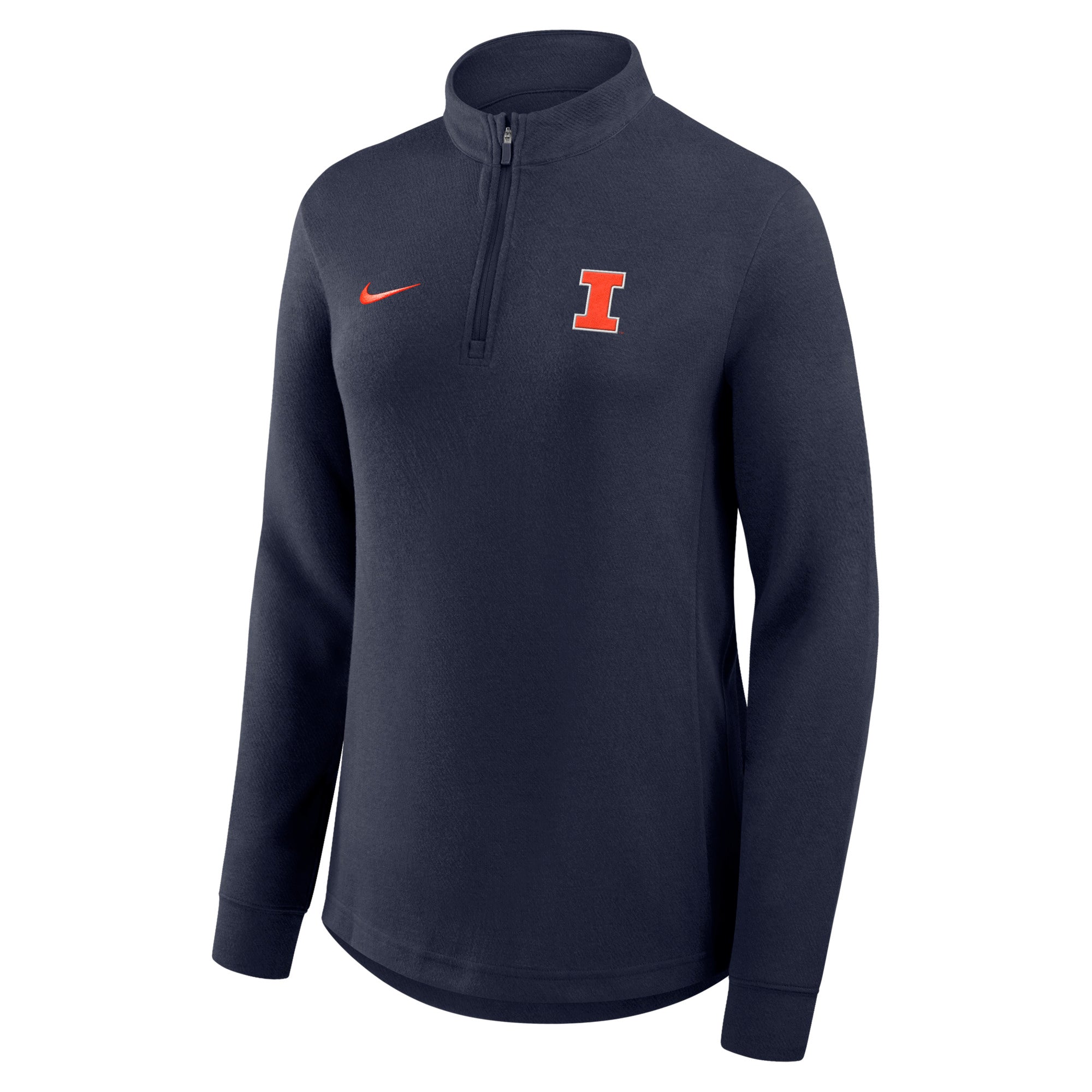 Go Illini! This Illinois jacket is perfect for wearing around campus or to games. This women's quarter-zip features a navy body with an orange Block I on the left alongside a Nike swoosh on the right. This Nike pullover is great for showing your Fighting Illini spirit! This is an officially licensed collegiate product.