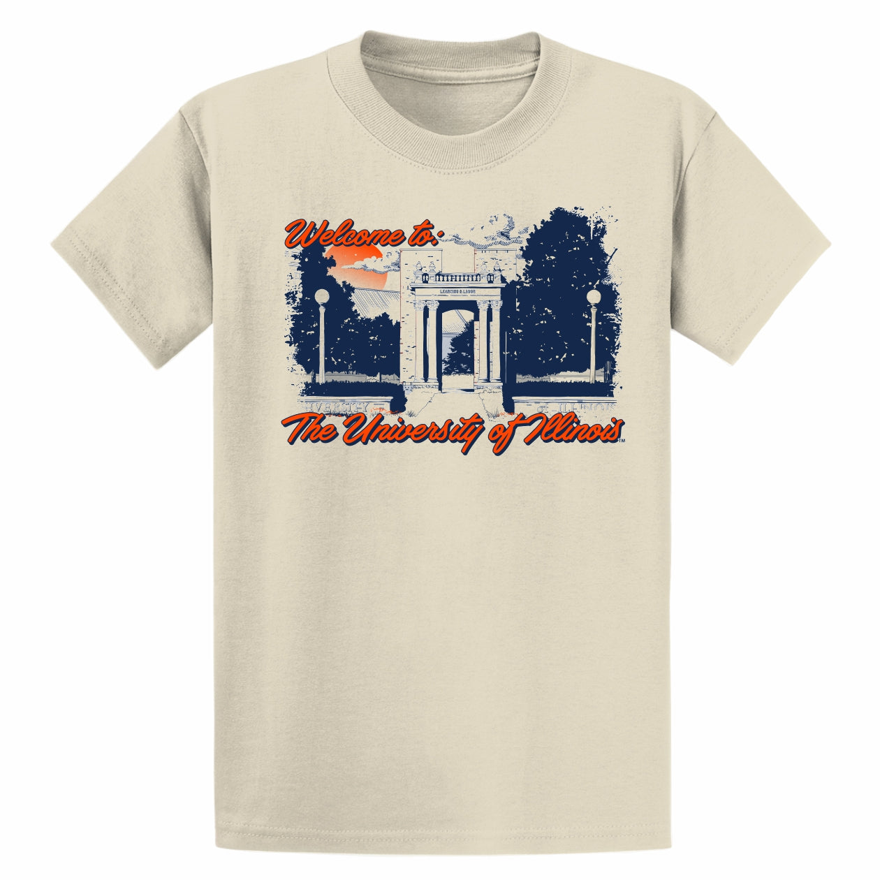 Hail to the orange! This Illinois t-shirt is a great way to show your Fighting Illini spirit! This BOGO tee features a khaki-colored body with a "Welcome to the University of Illinois" around an image of the Hallene Gateway that is great for showing your Illini pride. Make sure to pick up this Illinois tee to show off to your friends! This is an officially licensed collegiate product.