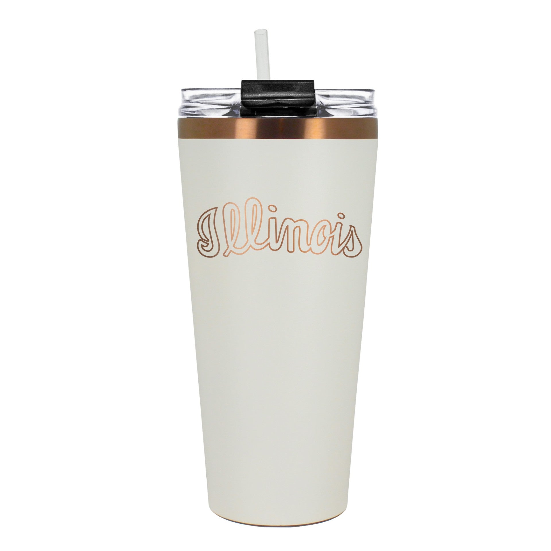 Go Illini! This Illinois tumbler is perfect for staying hydrated on the go! This tumbler features a cream-colored body with a copper script Illinois and lid/straw combo that will really make your Illinois spirit shine through! This is an officially licensed collegiate product.