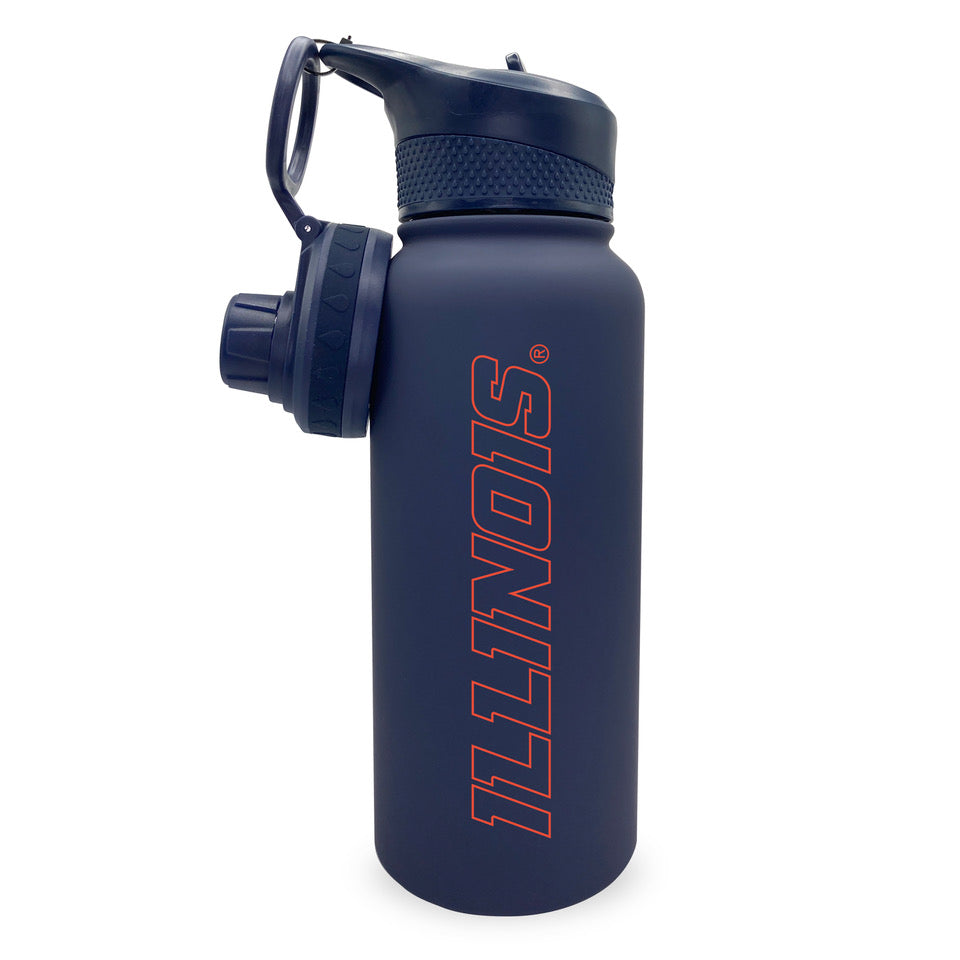 Go Illini! This Illinois water bottle is perfect for staying hydrated on the go! This 34oz bottle features a navy body with an orange slant "Illinois" on the side, along with two interchangeable lids that will really make your Illinois spirit shine through! This is an officially licensed collegiate product.