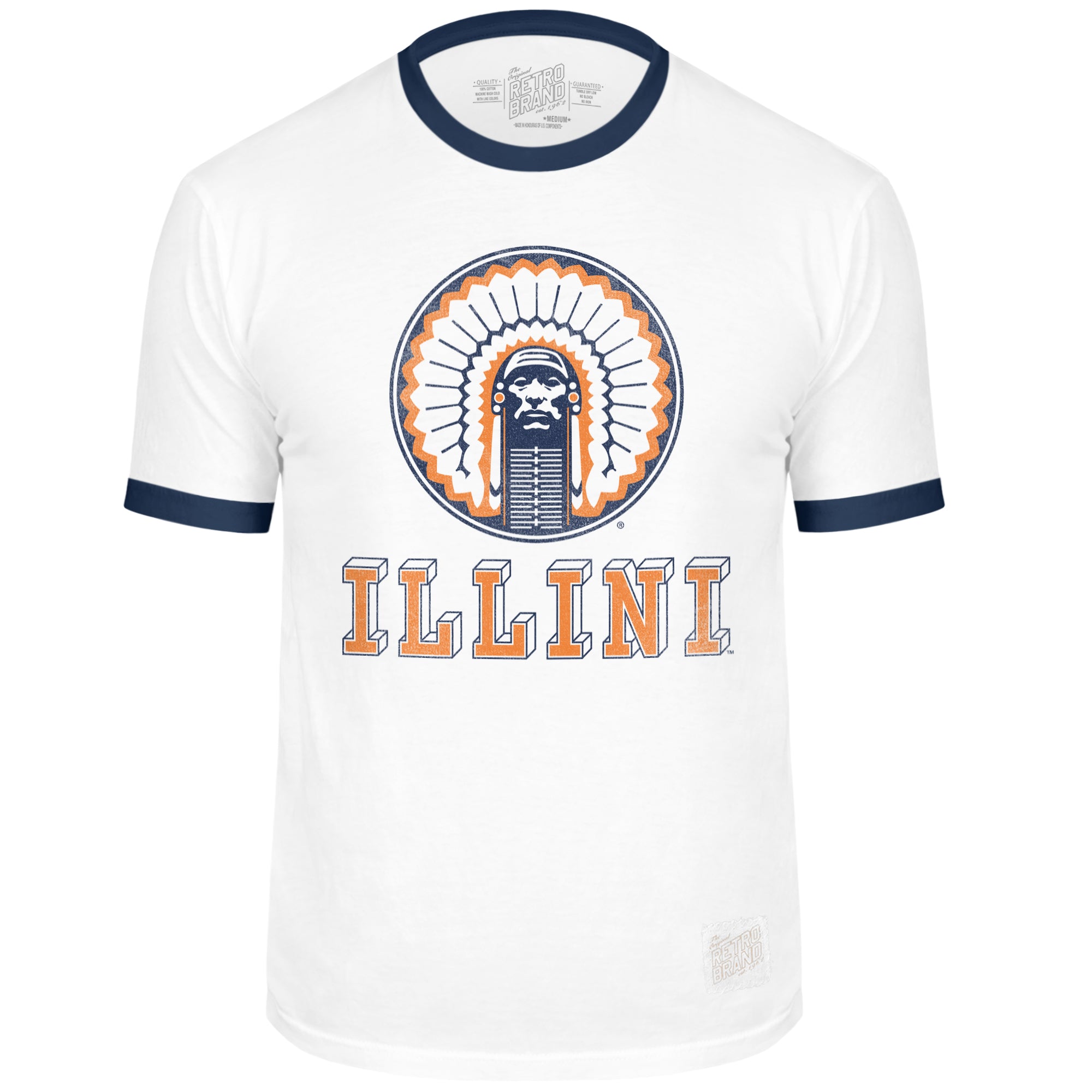 Throw it back in style with this Retro Brand Chief Illiniwek Ringer Tee! Featuring a classic white body with navy contrast sleeves and collar, this tee brings vintage vibes with a distressed Chief Illiniwek graphic on the front. The retro look and feel make it perfect for longtime fans and vintage lovers alike.