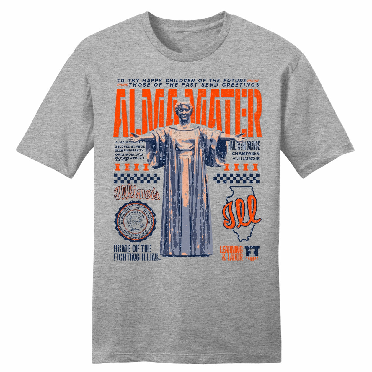 Go Illini! This Illinois t-shirt is perfect for showing your Illini pride! This tee features a grey body with an orange and blue Alma Mater design that will really make your Illinois spirit shine through! This is an officially licensed collegiate product.