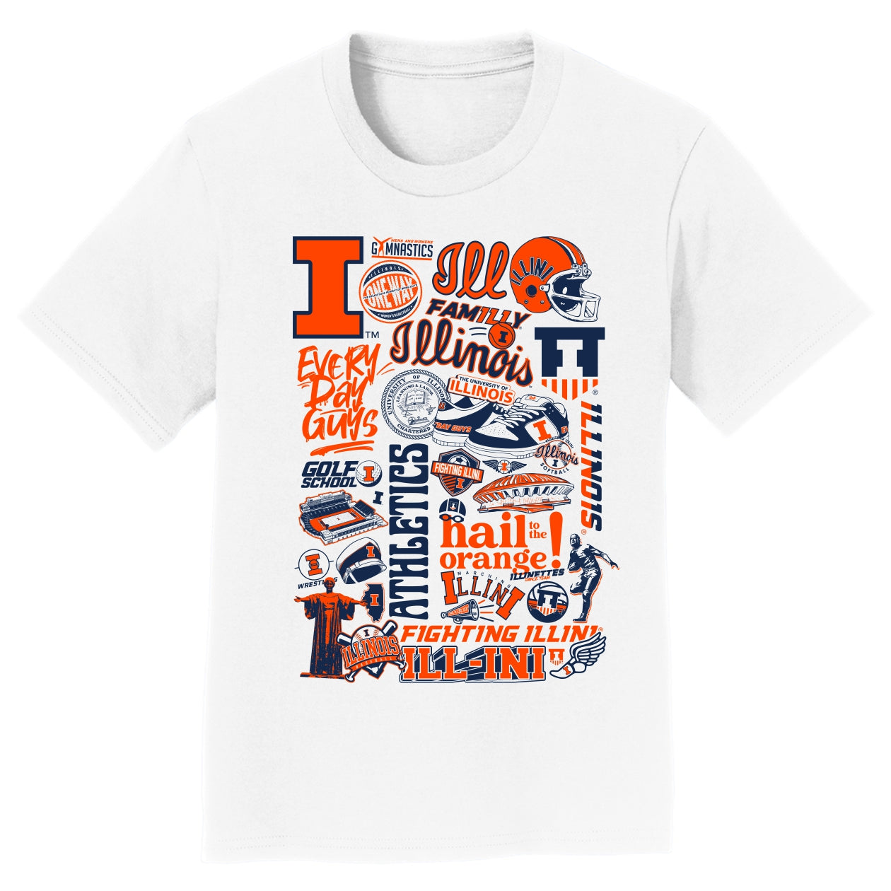 I-L-L! Pick up this Illinois shirt to really show your kiddo's Illini spirit! This Illinois Athletics shirt features a white body with a scattered design of orange and blue sports logos that will make an unforgettable addition to your Illini wardrobe! Get one online or in-store today! This is an officially licensed collegiate product.
