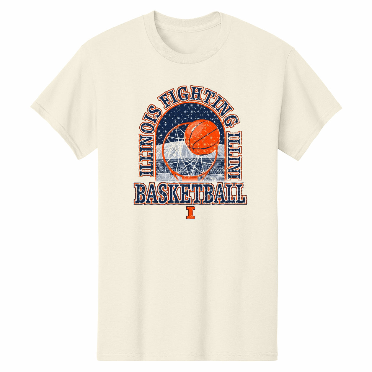 Go Illini! This Illinois Basketball shirt is perfect for wearing around campus or to games. This BOGO tee features a tan body with a navy and orange arched design with SFC pictured in the background. This Fighting Illini Basketball merch is great for showing your Illinois spirit! This is an officially licensed collegiate product.