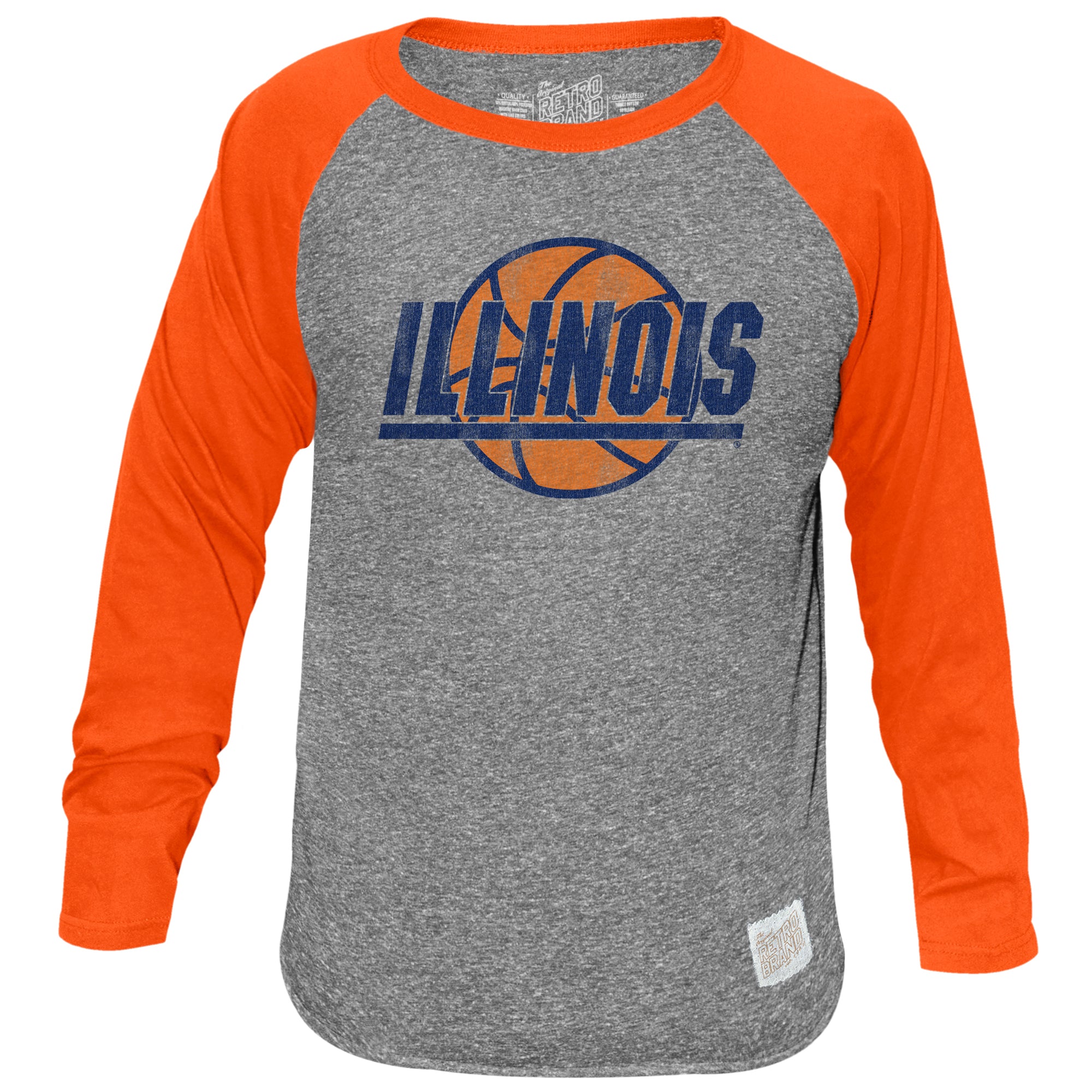ILL-INI! Gear up for game day with this Illinois Basketball shirt. This retro-style tee features a grey body with orange sleeves alongside a classic slant navy "Illinois" on the chest in front of a basketball design that Illini fans will love. Show your school spirit with this new Fighting Illini hoops shirt and cheer on Illinois in style! This is an officially licensed collegiate product.