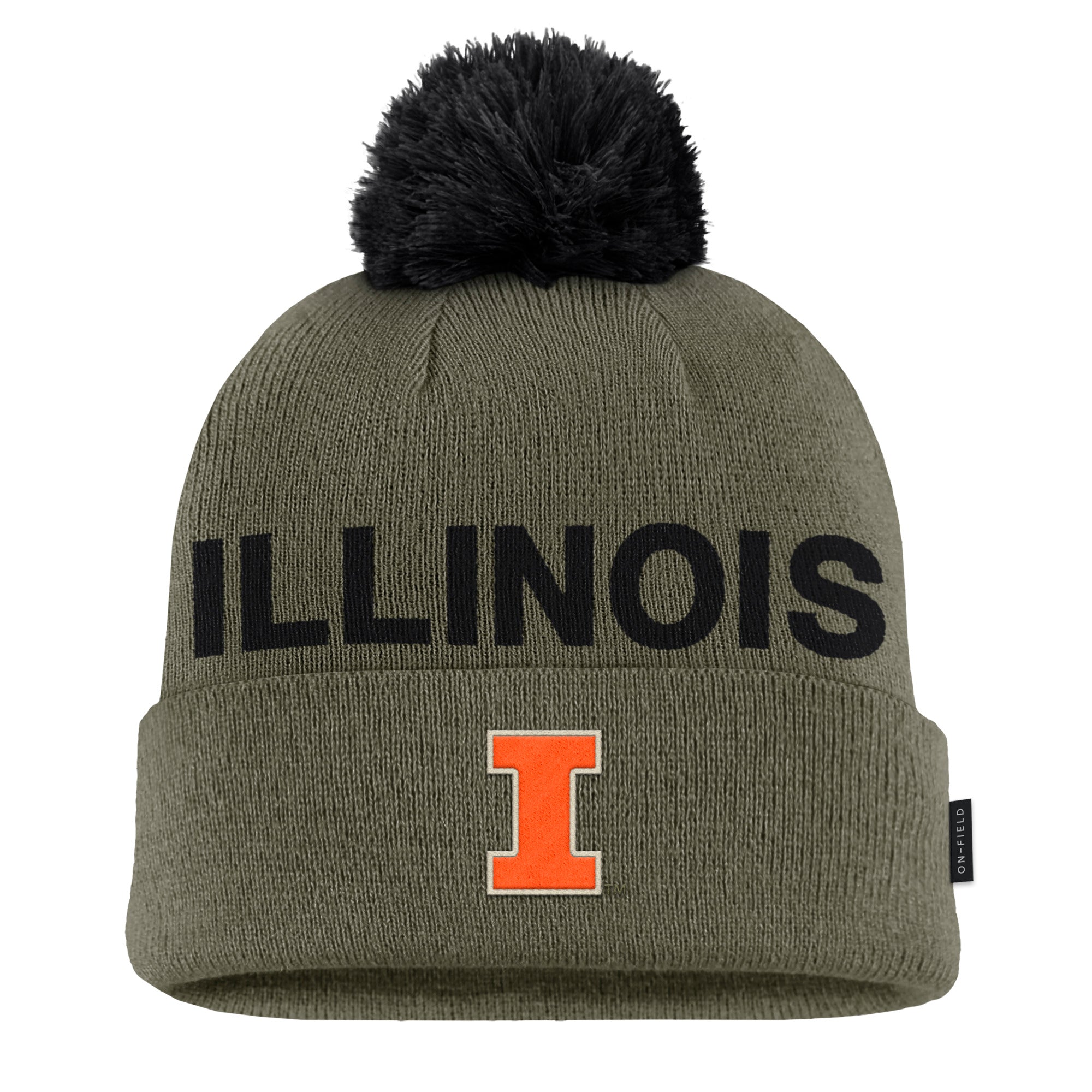 Represent the Illini everywhere you go with this Illinois beanie! This winter hat comes with a knit olive-colored body with a bold "Illinois" and orange Block I on the cuff alongside an American flag and a black pom on top that makes it a must-have. Whether you’re in the stands or walking across campus, this new Nike hat will keep your Fighting Illini spirit strong! This is an officially licensed collegiate product.