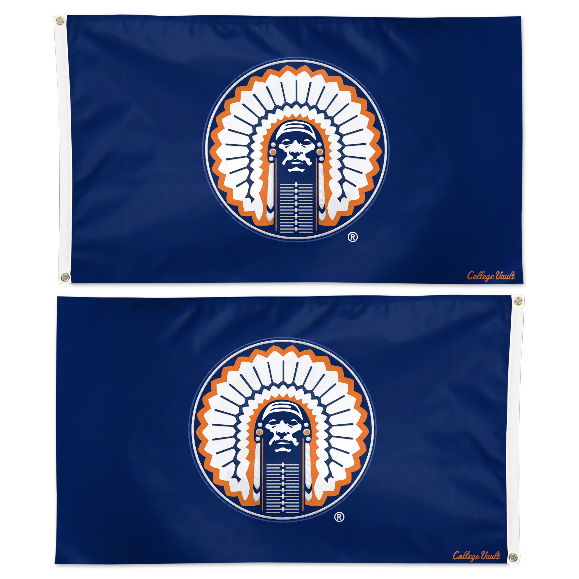 I-L-L! Pick up this Illinois Fighting Illini 3'x5' Navy Chief Flag to really show your Illini spirit! This flag features a navy background with a Chief logo that will make an unforgettable addition to your home/office or room! Get one online or in-store today! This is an officially licensed collegiate product.