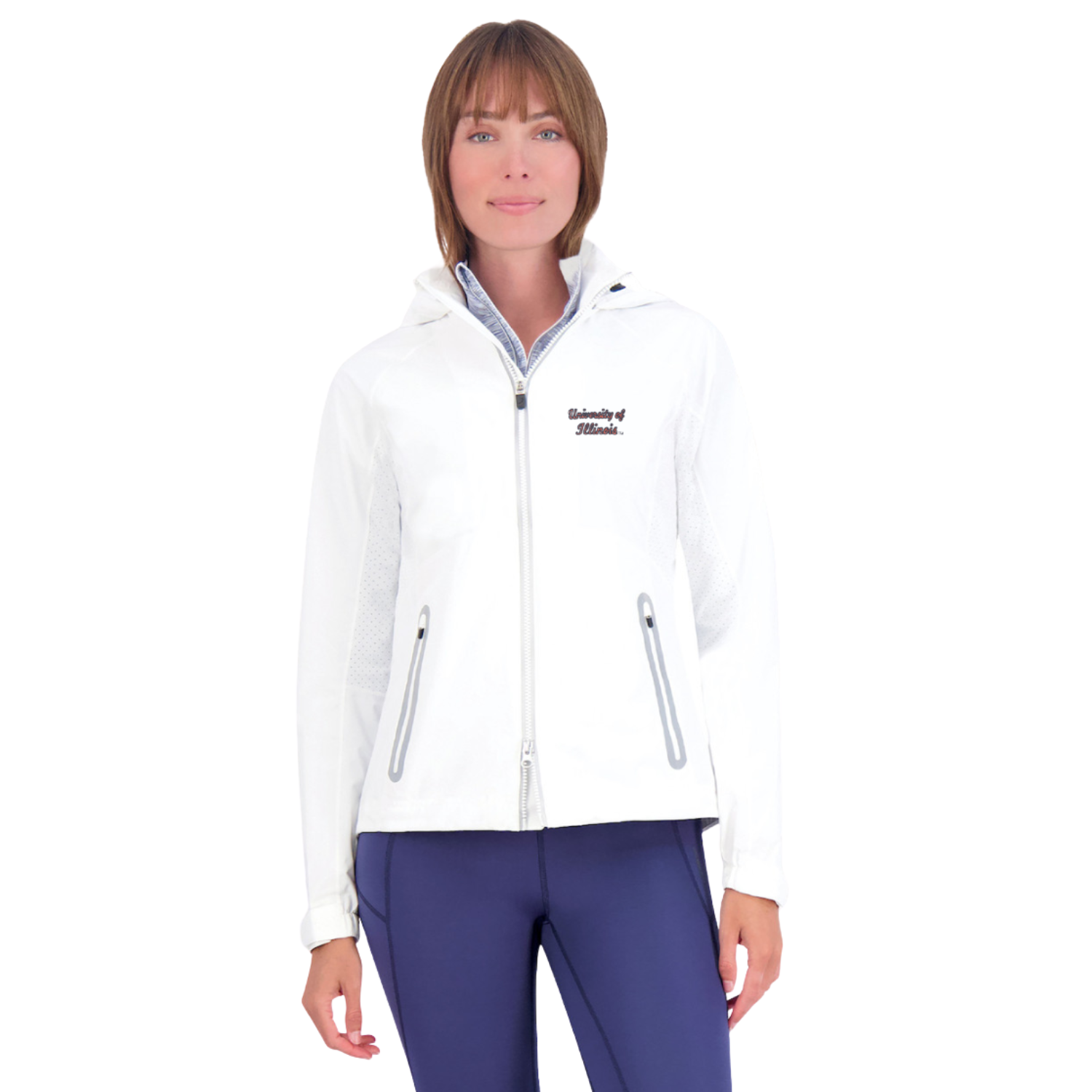 Go Illini! This Illinois jacket is perfect for wearing around campus or to games. This women's jacket features a white body with a navy/orange script "University of Illinois" on the left, alongside a full-zip front and hood. This U of I piece is great for showing your Fighting Illini spirit! This is an officially licensed collegiate product.