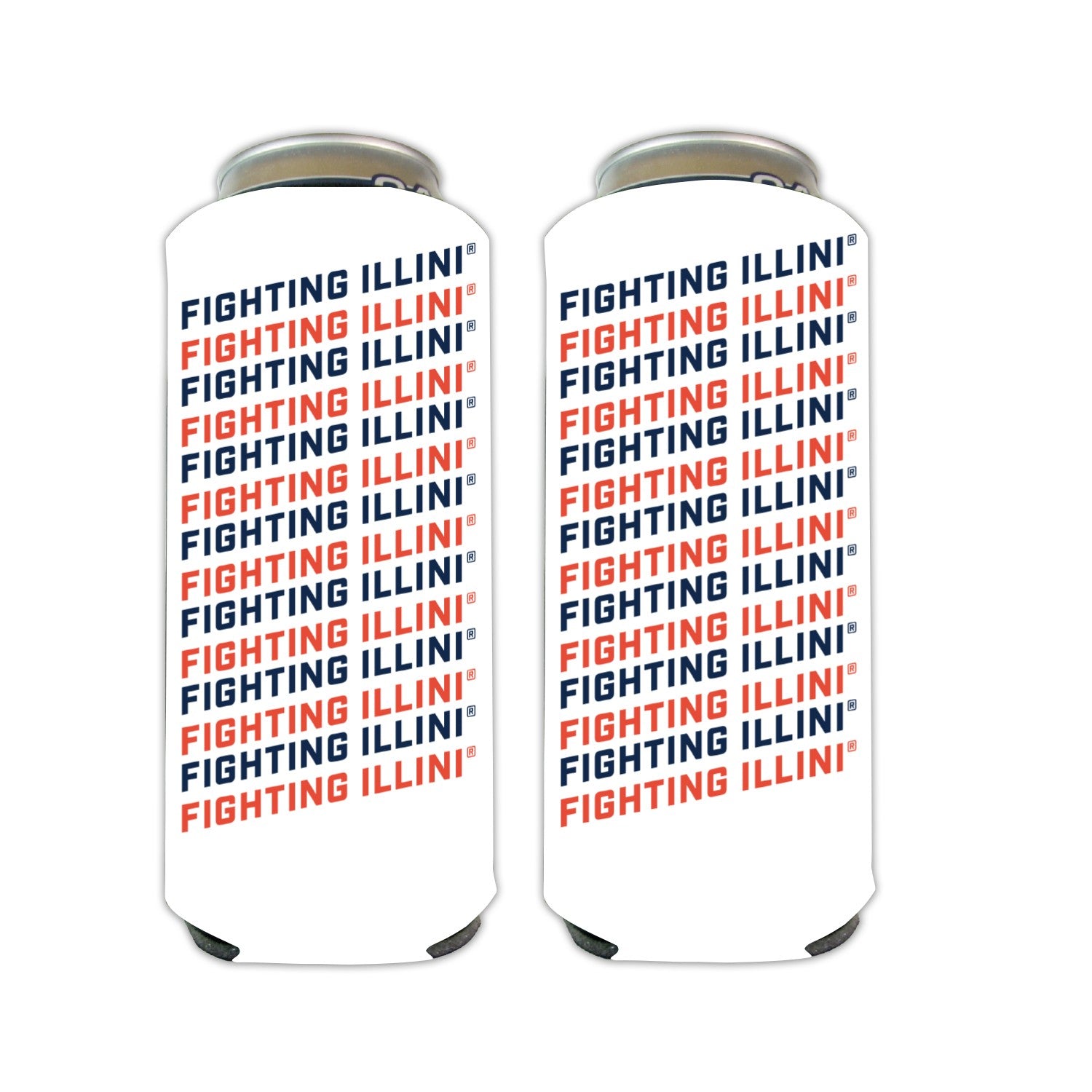 I-L-L! Pick up this Illinois koozie to really show your Illini spirit! This 24oz koozie features a white body with navy/orange "Fighting Illini" repeating that will make an unforgettable addition to your tailgates or watch parties! Get one online or in-store today! This is an officially licensed collegiate product.