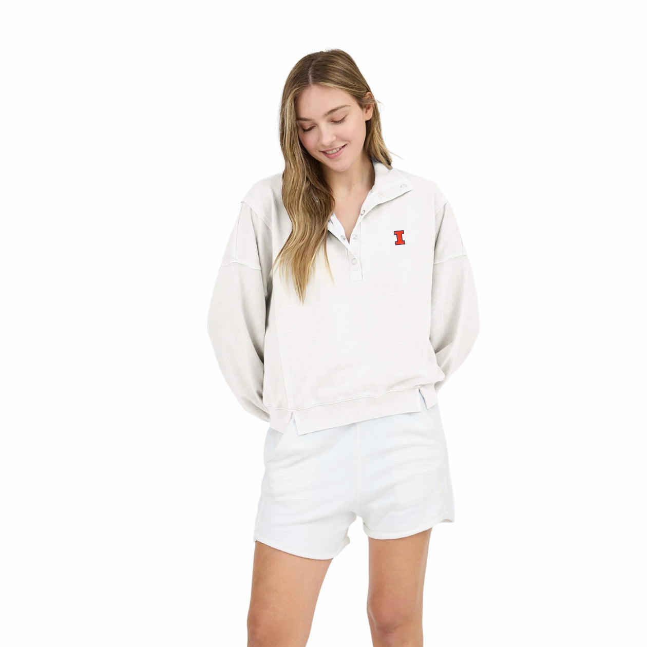 Go Illini! This Illinois pullover is perfect for wearing around campus or to games. This women's top features a tan lightweight French terry material with a snap top and an orange Block I. This new Illinois merch is great for showing your Fighting Illini spirit! This is an officially licensed collegiate product.