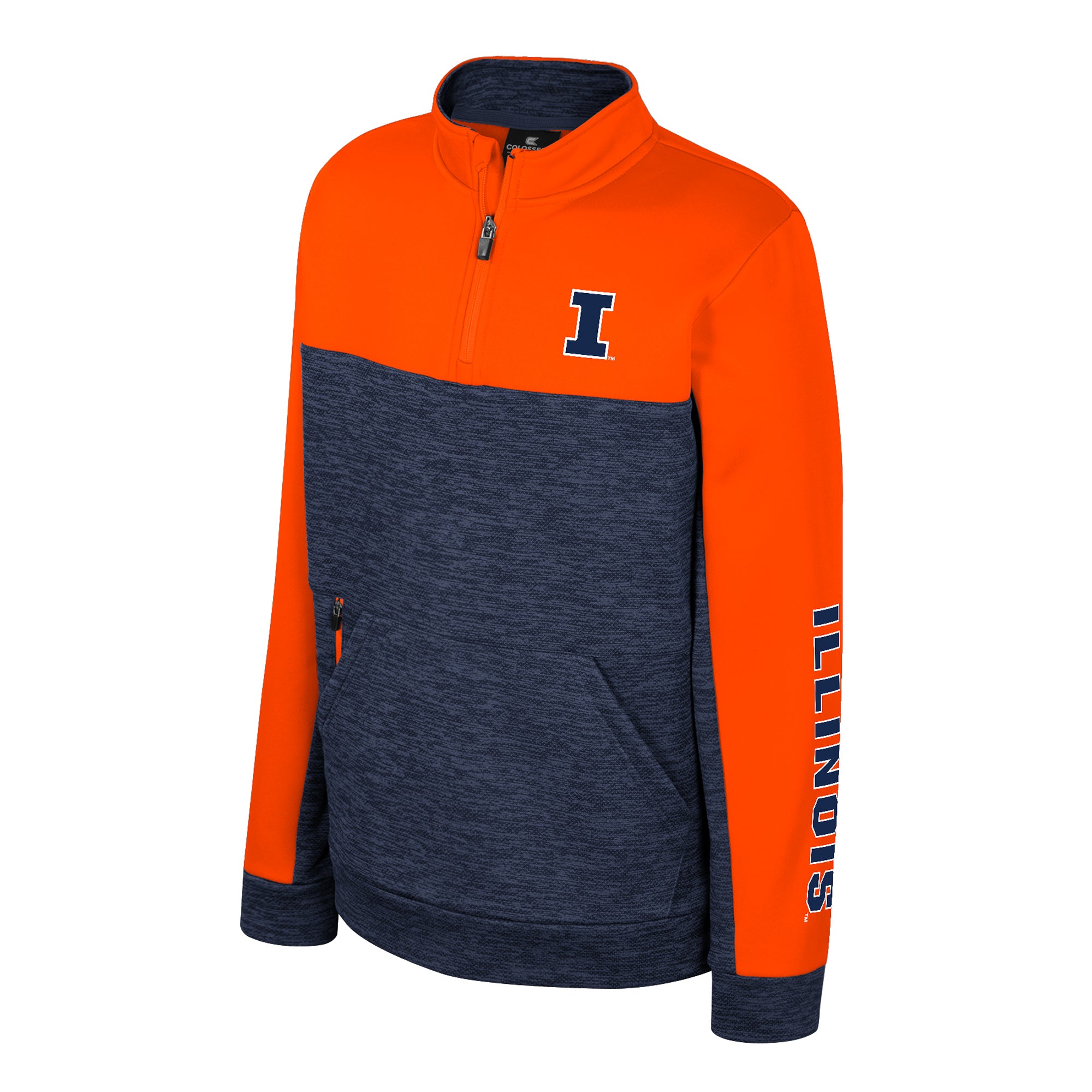 Hail to the orange! This Illinois quarter-zip is a great way to show your kiddo's Fighting Illini spirit! This kids pullover features a navy body with orange shoulders/sleeves alongside a navy Block I on the right chest and an Illinois down the right sleeve that is great for any occasion. Make sure to pick up this Illinois jacket to show off your kiddo's Illini pride! This is an officially licensed collegiate product.
