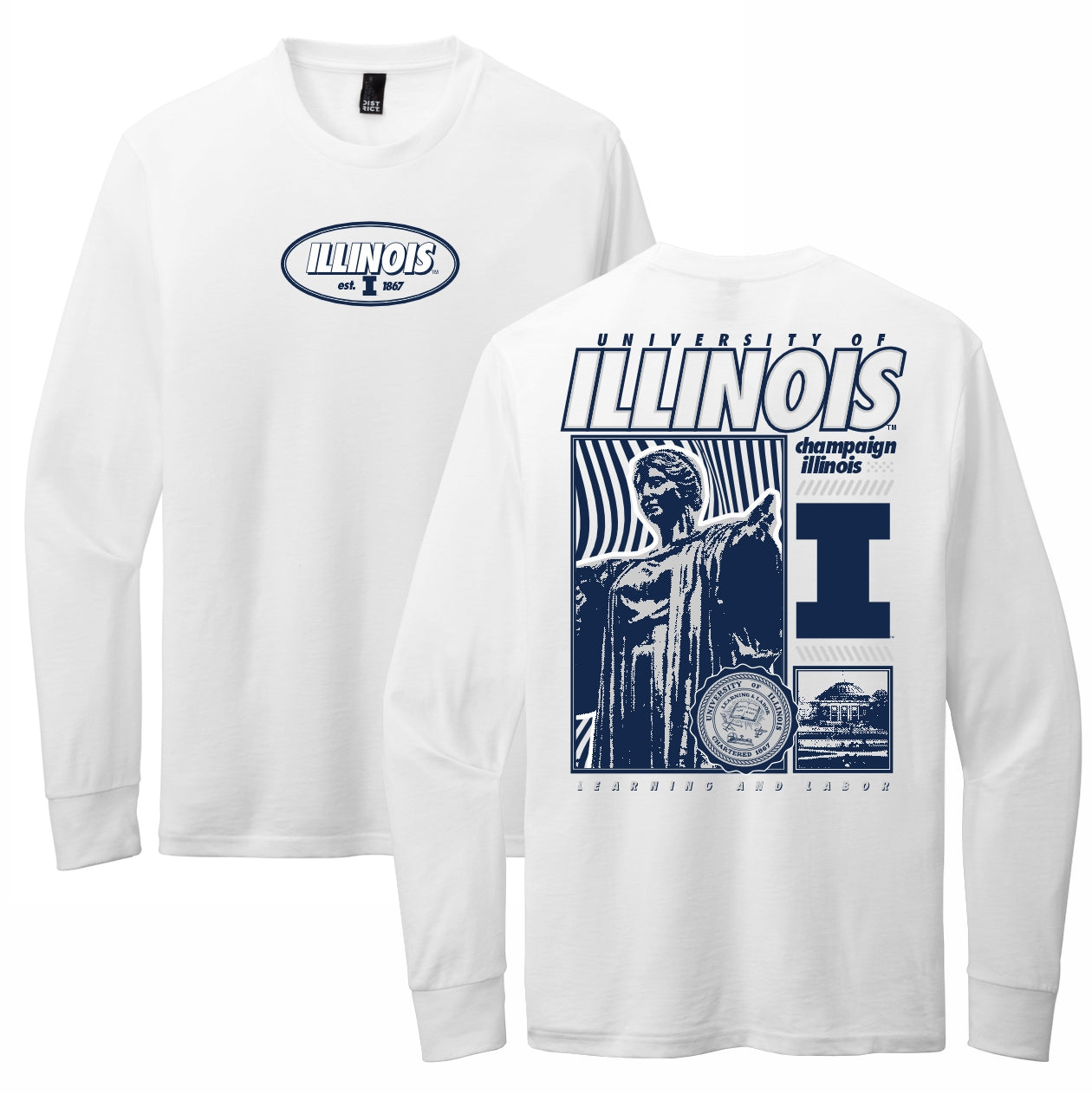 Go Illini! This Illinois t-shirt is perfect for wearing around campus or to games. This long-sleeve tee features a white body with a navy oval design on the front and an Alma Mater design on the back. This BOGO tee is great for showing your Fighting Illini spirit! This is an officially licensed collegiate product.