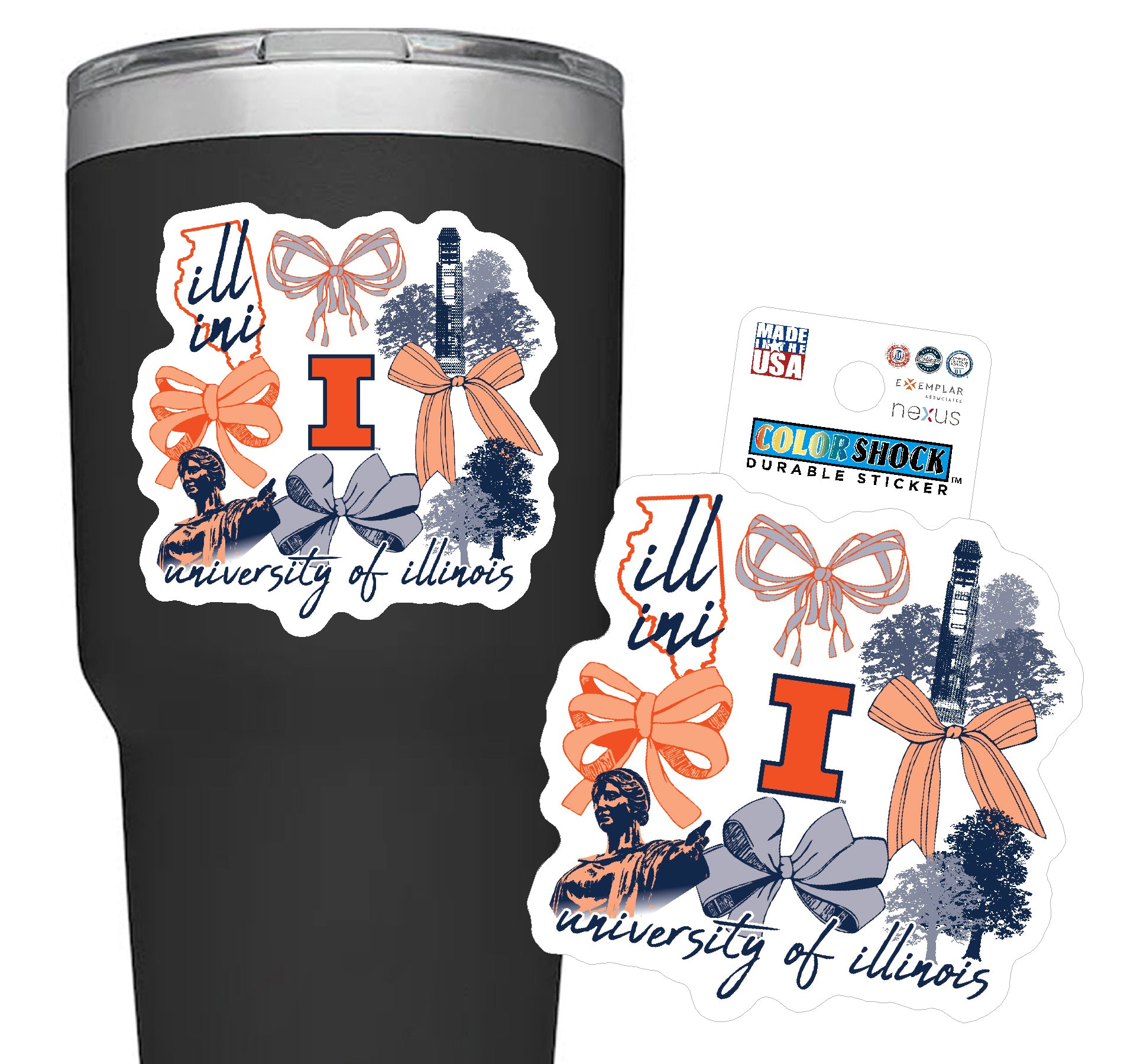 Go Illini! This Illinois sticker is perfect for your water bottle, laptop, or anywhere you put stickers! This sticker features a white background with orange/blue bows and campus icons that will really make your Illinois spirit shine through! This is an officially licensed collegiate product.