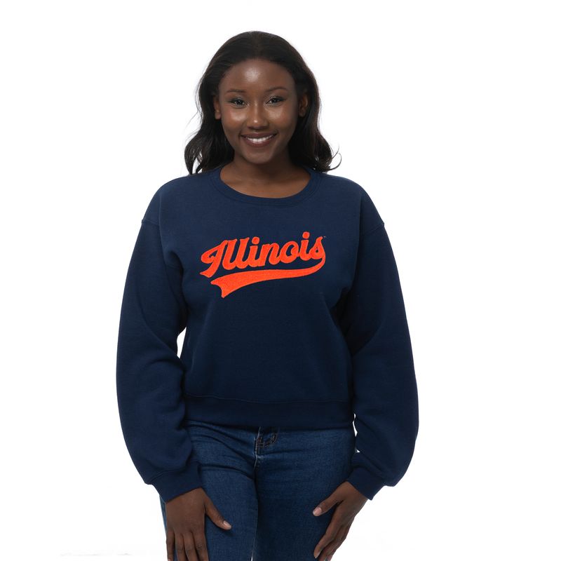 ILL-INI! Gear up for game day with this Illinois sweatshirt. This women's pullover features a short navy fleece body with an orange script "Illinois" that Illini fans will love. Show your school spirit with this crewneck and cheer on Illinois in style! This is an officially licensed collegiate product.