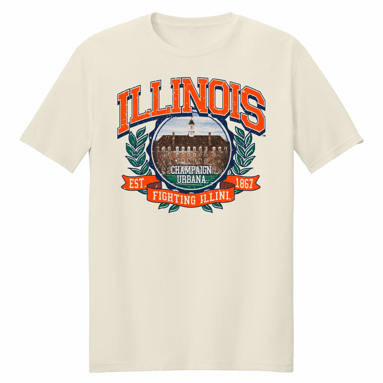 I-L-L! Pick up this Illinois t-shirt to impress your friends! Once they see you wearing this Illini BOGO tee, they’re going to want one too! This shirt features a khaki-colored body with a colorful design of the Illini Union with a laurel around it perfect for showing your Illinois spirit at games, tailgates, or just around campus. This is an officially licensed collegiate product.