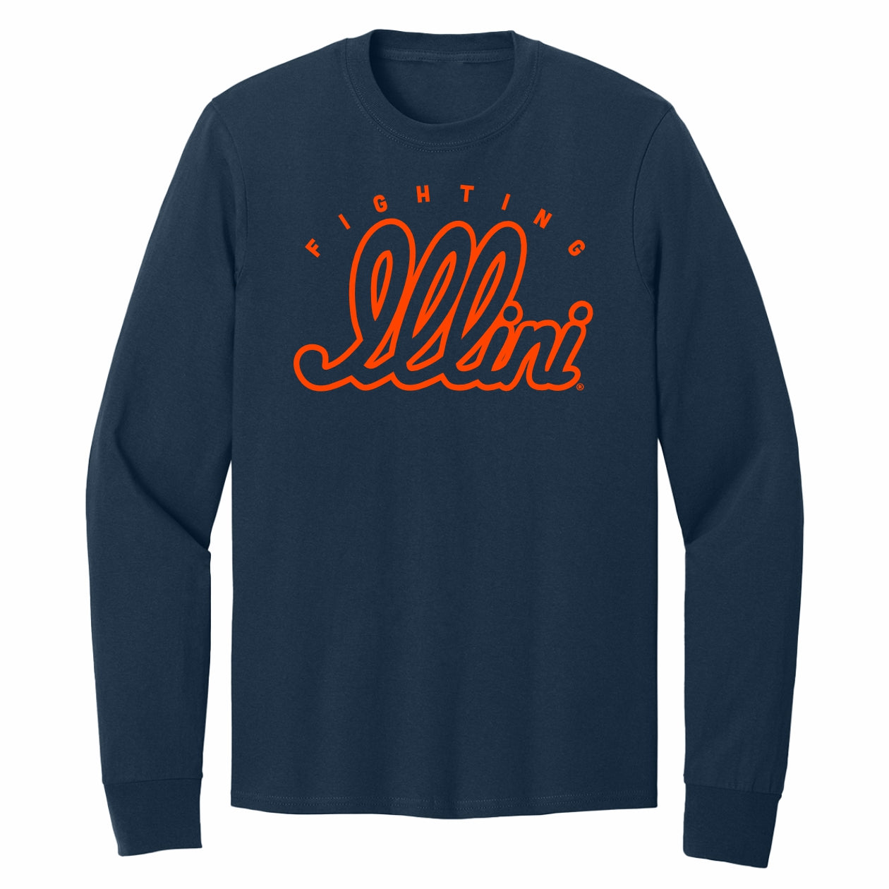 Go Illini! This Illinois t-shirt is perfect for wearing around campus or to games. This long-sleeve BOGO tee features a navy body with a script "Illini" under an arched "Fighting". This Illinois tee is great for showing your Fighting Illini spirit! This is an officially licensed collegiate product.