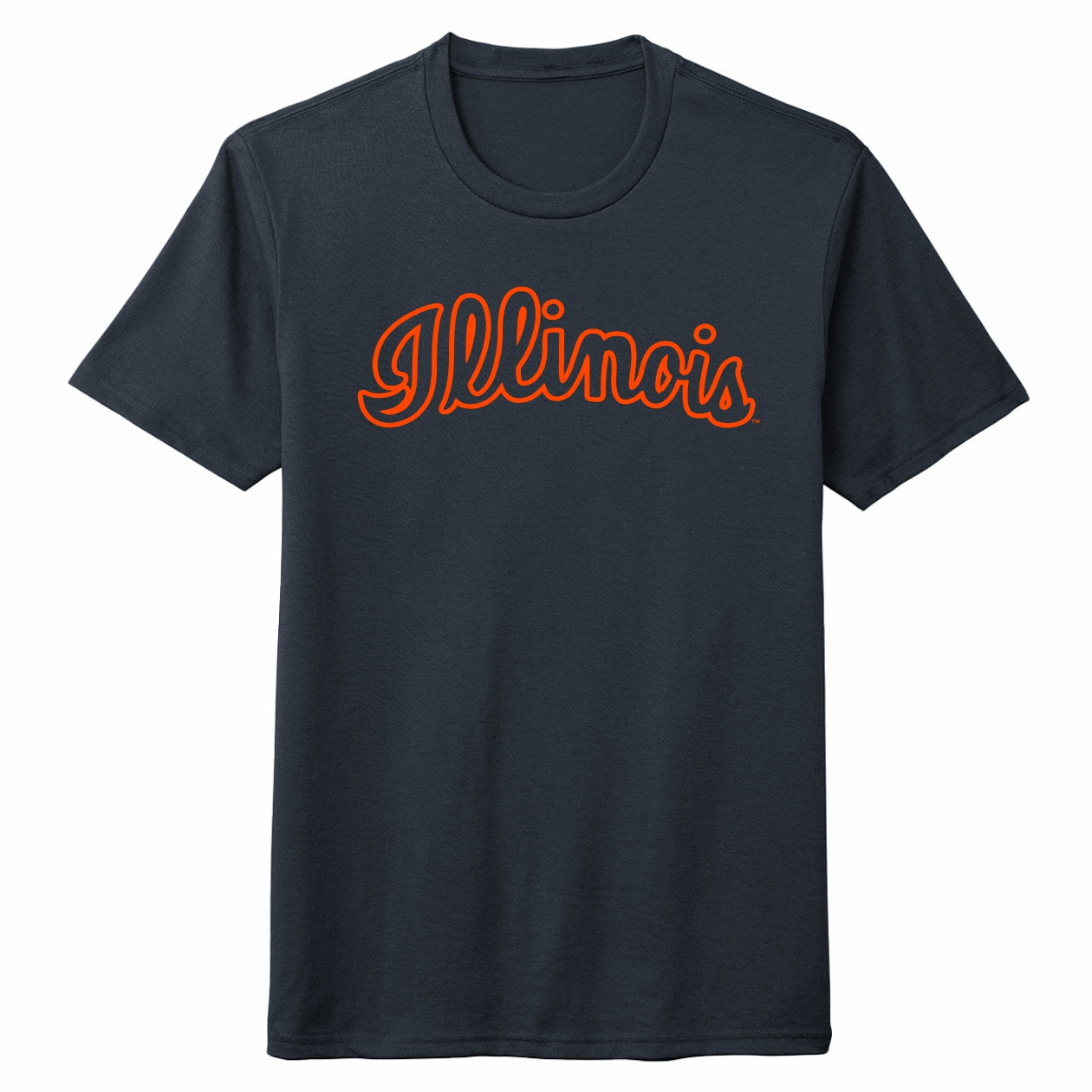Go Illini! This Illinois t-shirt is perfect for wearing around campus or to games. This BOGO tee features a navy body with an orange script "Illinois" on the front. This t-shirt is great for showing your Fighting Illini spirit! This is an officially licensed collegiate product.