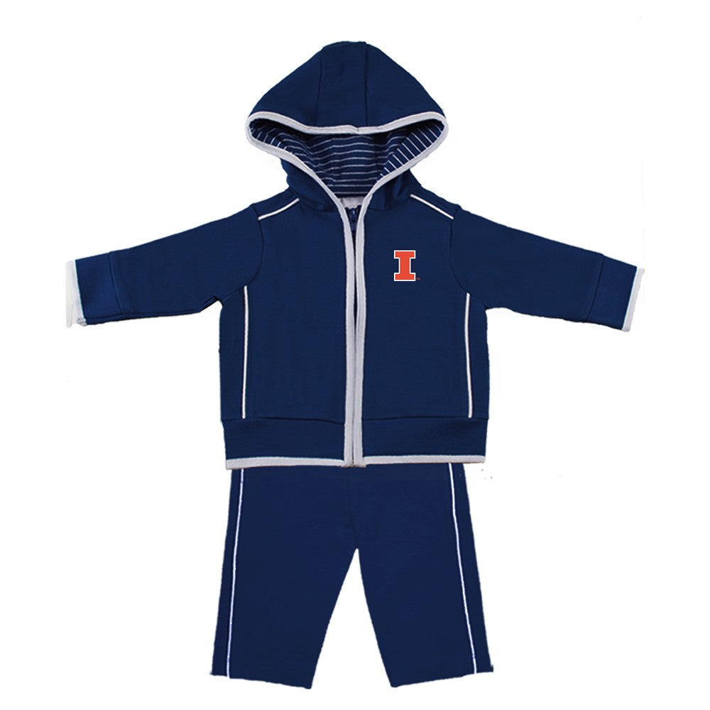 Go Illini! This Illinois outfit is perfect for your toddler! This outfit features a navy hoodie with an orange block I and pants with grey accents that will really make your little one's Illinois spirit shine through! This is an officially licensed collegiate product.