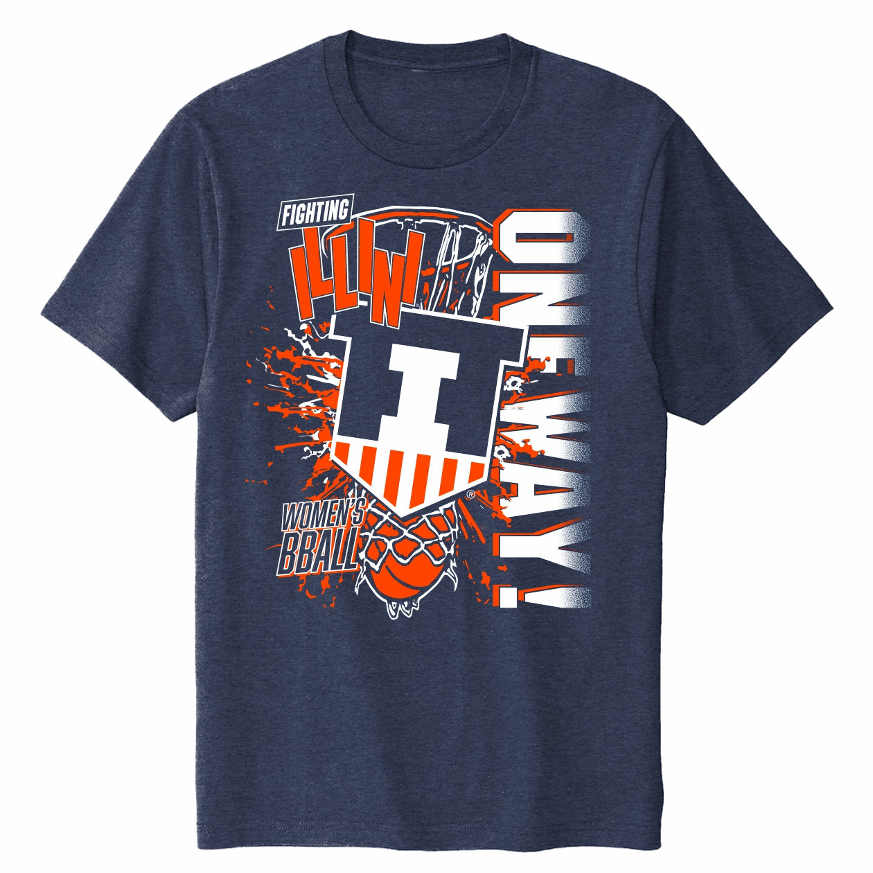 Go Illini! This Illinois Women's Basketball shirt is perfect for wearing around campus or to games. This BOGO tee features a navy body with an orange/white Fighting Illini Women's BBall One Way design. This new tee is great for showing your Fighting Illini spirit! This is an officially licensed collegiate product.