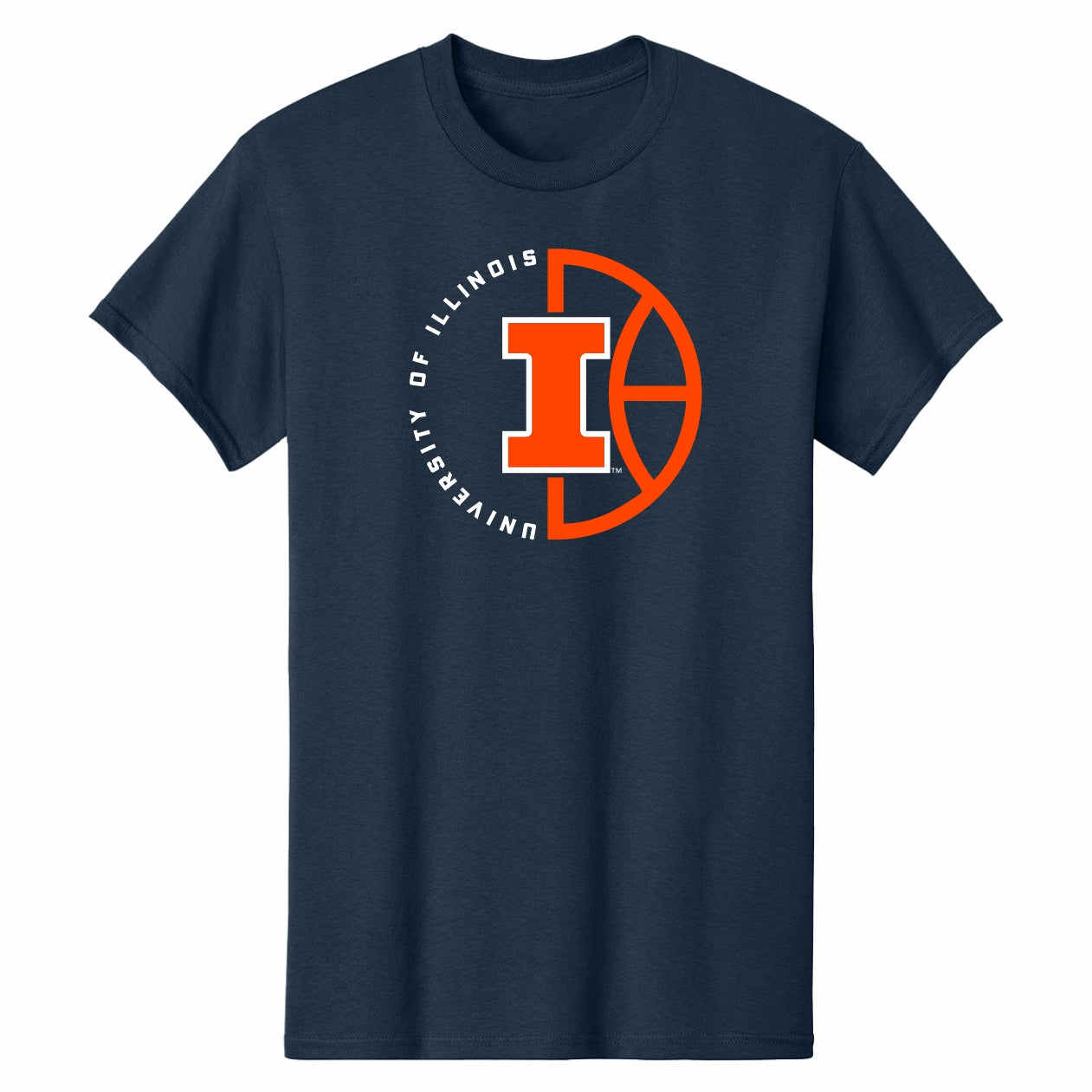 Show your Orange and Blue pride! This Illinois Basketball shirt is perfect for any Illini fan. This BOGO tee features a navy body with an orange and white "University of Illinois" basketball design that makes it great for games, tailgates, or campus wear. Don’t miss out on this new U of I merch to show your Fighting Illini spirit! This is an officially licensed collegiate product.